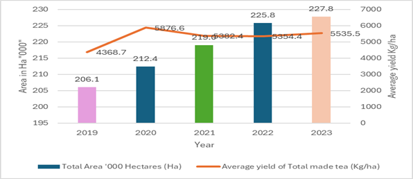 Tea is cultivated in 21 counties with smallholder farmers (650,000 farmers) accounting for 60 per cent produce while estate farmers produce 40 per cent in 25 farms. The small and medium farms employ over 3 million people while large farms employ over 100,000 in activities such as manual and machine tea pickers, pruners, farm managers and casual labourers. Tea farming acreage has constantly increased from 2019 to 2023, translating to more demand for labour in tea picking. However, the average yield of marketed tea fluctuated for the period exhibiting highest performance in 2020 (Figure 1).