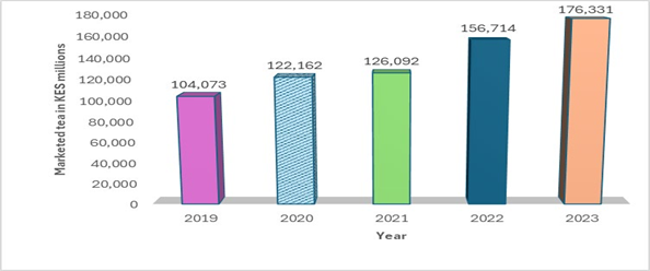 The export market consumes the largest share at 99 per cent as at 2023 with over 85 global markets across Europe, Middle East and Asia. Currently, there are four exporters, namely KTDA, Finlay’s, Williamson tea and East African Tea Trade Association, and also wholesalers, retailers, tea vendors, hawkers, and brokers. Moreover, the value of the marketed tea over the last five (5) years has been on an upward trend as shown in Figure 2.