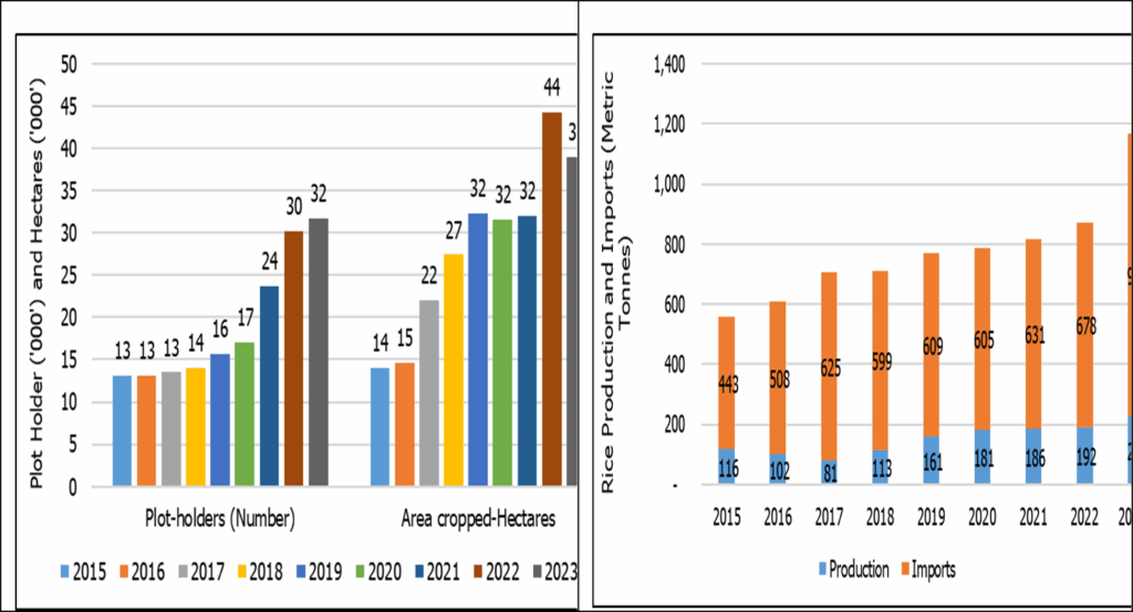 Domestic rice production was 229.1 metric tons, meeting only 10 per cent of the local demand supplemented by 937.1 metric tons of imports by 2023. Meanwhile, approximately 300,000 rice farmers rely on rice farming for their livelihood. The total land area under rice production was estimated at 42,895 hectares in 2019, employing 15,547 farmers as outlined in Table 1. Rice paddy production increased by 68.5 MT supported by an increase of 18,647 plot holders in the rice irrigation schemes in 2023. The area cropped in irrigation schemes has improved by 24,941 in the same period as shown in Figure 1 below. This demonstrates the untapped potential in the schemes for more produce and jobs.